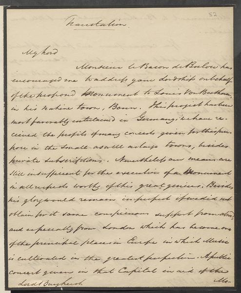 a sculptured Monument of a noble description as may be practicable. Respecting the properest place for the erection of such a monument there can be no doubt. The city of Bonn on the Rhine, the Birthplace of the immortal Artist distinguished also by its agreeable situation, the resort of innumerable strangers seems to be equally entitled and bound to have the precedence in this undertaking and with this view an association has been formed here which has obtained the sanction of the King’s Ministers within whose resort affairs of this nature belong. But considering that if it is to be in any degree worthy of the great man to whom it [3] is designed to commemorate, ample means will be required to carry it into effect. We the undersigned venture to address to all the admirers of Beethoven a request that they would assist us in realising our intentions by their zealous cooperation – whether by private collections of subscriptions, by Concerts and dramatic representations for this express purpose. We are persuaded that we may confidently expect not only that all friends of musical science will attend such representations in great numbers but also that the artists who bear a part in them will readily embrace the opportunity of testifying by a small offering their reverence and gratitude for the deceased master to whom they owe so many and such excellent enjoyments.