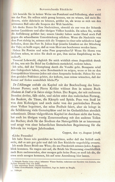 · Pange, Pauline de: August Wilhelm Schlegel und Frau von Staël. Eine schicksalhafte Begegnung. Nach unveröffentlichten Briefen erzählt von Pauline Gräfin de Pange. Dt. Ausg. von Willy Grabert. Hamburg 1940, S. 177–178.