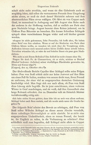 · Pange, Pauline de: August Wilhelm Schlegel und Frau von Staël. Eine schicksalhafte Begegnung. Nach unveröffentlichten Briefen erzählt von Pauline Gräfin de Pange. Dt. Ausg. von Willy Grabert. Hamburg 1940, S. 258.
