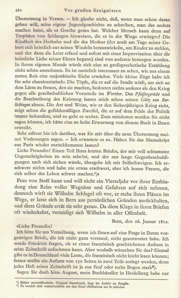 • Bibliographische Angabe: Pange, Pauline de: Auguste-Guillaume Schlegel et Madame de Staël d’apres des documents inédits. Paris 1938, S. 353.