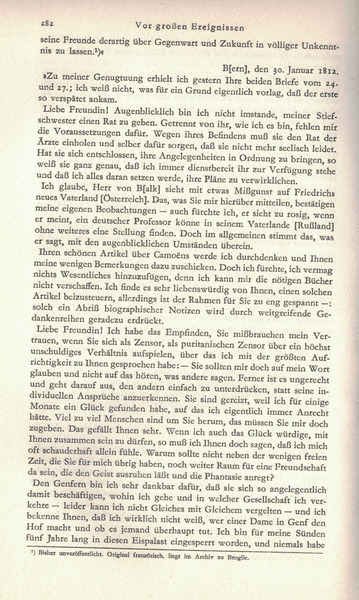 Je me flatte que M. de B[alk] voit un peu avec défaveur la nouvelle patrie de Frédéric, du moins ce que vous m’indiquez m’est nettement confirmé par mes propres observations – je crains aussi qu’il exagère un peu les facilités qu’un professeur allemand trouveroit dans la sienne. Cependant ce qu’il dit s’accorde assez avec les circonstances du tems.